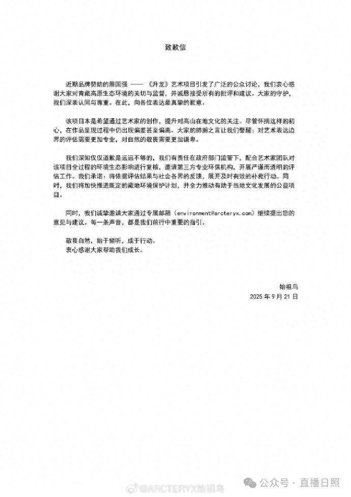 9月21日,@ARCTERYX始祖鸟 发布致歉信称,感谢大家对青藏高原生态环境的关切与监督,并诚恳接受所有的批评和建议。向各位表达最诚挚的歉意。始祖鸟承诺将依据评估结果和社会各界反馈,展开及时有效的补救行动。