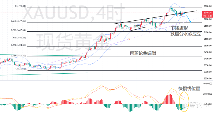 不过一旦四小时下破零轴,那么日线的死叉也会成立,同时该时间段内,收敛运行的黄金会被当作是下降旗形的旗面部分,再次延续下跌,一倍量就轻松多了。经测算,基本处于3688一带。
